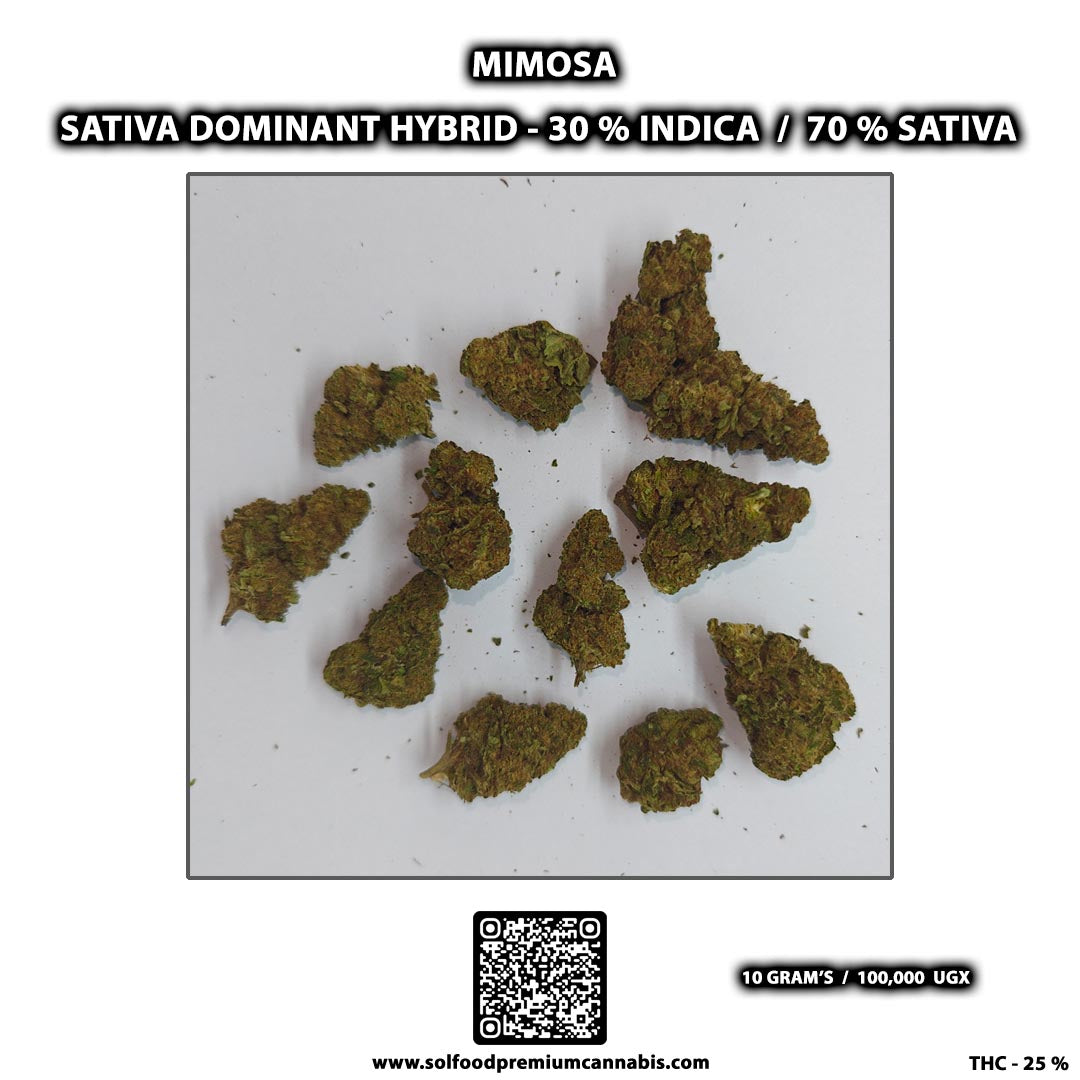 Mimosa is a Sativa dominant hybrid strain (70 % Sativa / 30 % Indica) created through crossing the classic Purple Punch X Clementine strains. If you're looking for an early morning pick me up (minus the alcohol), this bud is totally for you. Mimosa packs bright and happy daytime effects that are perfect for chasing sleep away and giving you a positive mood as you take on your day. You'll feel an energetic, clear headed lift at the onset of the high, which fills your brain with euphoric motivation and laser sharp focus. A light tingle accompanies these effects, resting mainly in the body rather than your head. With these effects and its high 19 - 27% average THC level, Mimosa is said to be the perfect choice for treating those suffering from conditions such as depression, chronic stress or anxiety, ADD or ADHD, migraines and nausea or appetite loss. This bud has a sweet and sour tropical citrus flavor with a light berry exhale, almost like a fresh mimosa! The aroma follows the same profile, although with an influx of woody florals and fresh earthy herbs. Mimosa buds have rounded dense small olive green nugs with lots of dark orange hairs and a coating of bright white crystal trichomes. If you’ve smoked, dabbed or consumed Mimosa, tell us about your experience by leaving a strain review. |